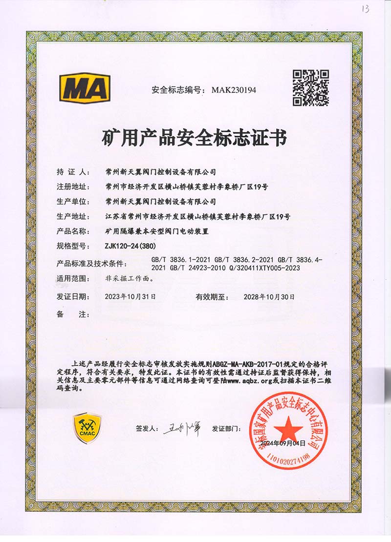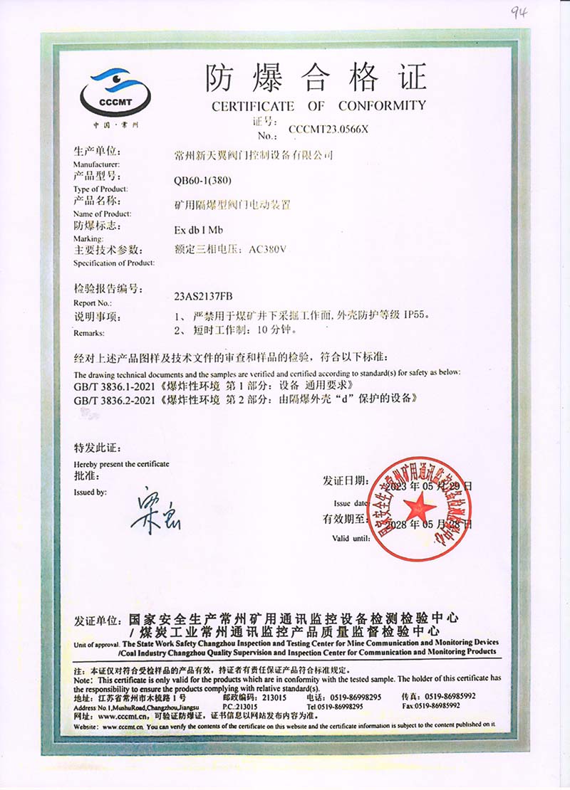 礦用隔爆ZB10-24中國國家強制性產品認證證書110.2